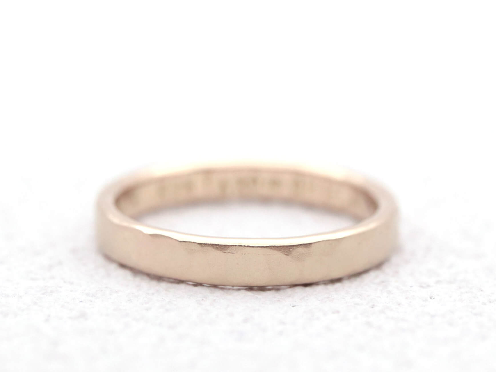 K18 champagne gold hammered wedding band. It has a matte texture with a blasted finish to matte the gold. It is a beautiful ring that is not too sparkly and has a calm atmosphere. It is a design that even those who are not accustomed to wearing jewelry can wear without feeling self-conscious.