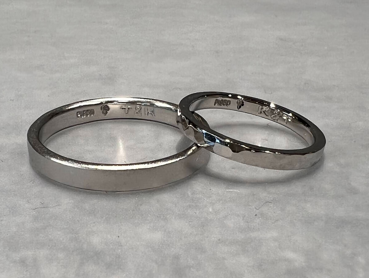A plain matte wedding band and a hammered wedding band. We matched the materials and each selected their favorite finish.Frosted and hammered platinum handmade wedding bandFrosted plain wedding band(Left) Blast and Hairline Platinum 950 Machine Engraving 3.0mm width ¥99,000Wedding Band(Right) Hammered Platinum 950 Machine Engraving Width 2.0mm ¥66,000() ¥ 投稿ナビゲーションChampagne Gold Engagement Ring with Foresta TextureSparkling handmade silver ring with pink tourmaline birthstone