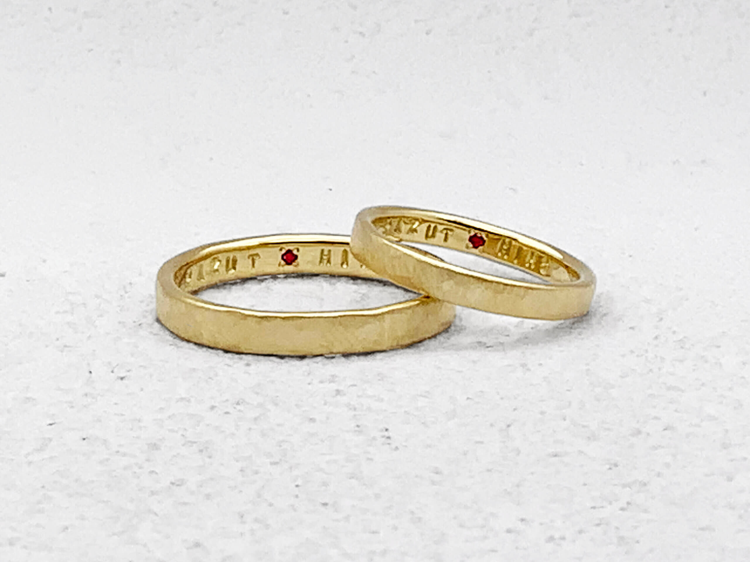 This handmade yellow gold wedding band has a matching hammered frosted finish. There is a matching ruby clasp on the inside as well. The red ruby looks great against the yellow. The 2.5mm wide ring on the right in the photo also has a diamond on the front.