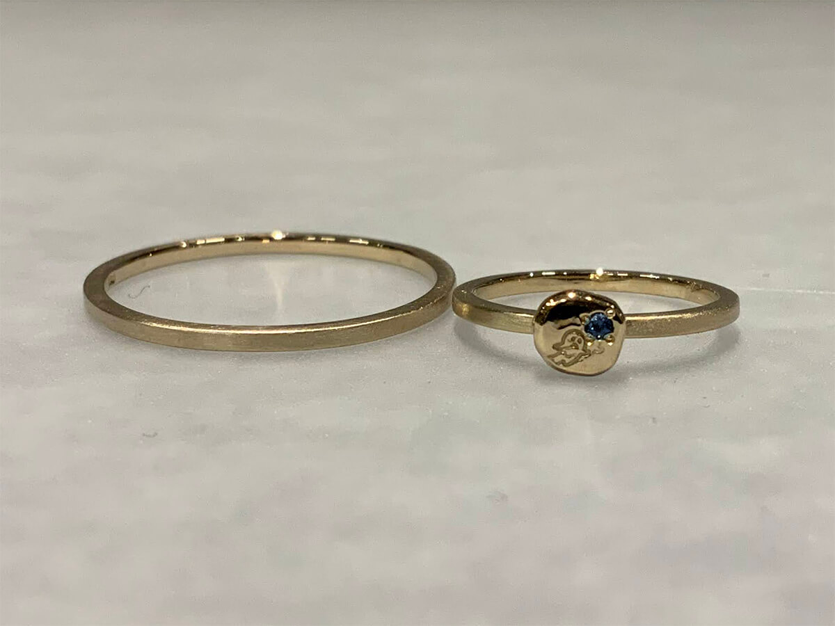 This layered ring has a hairline matte finish. The ring on the right side has a round shaped "signet" option. The layered ring is too thin to be engraved, but the signet part can be engraved. Layered rings are too thin to be engraved. Signets can be engraved and can also hold birthstones or diamonds. The ring on the right here has a blue sapphire.