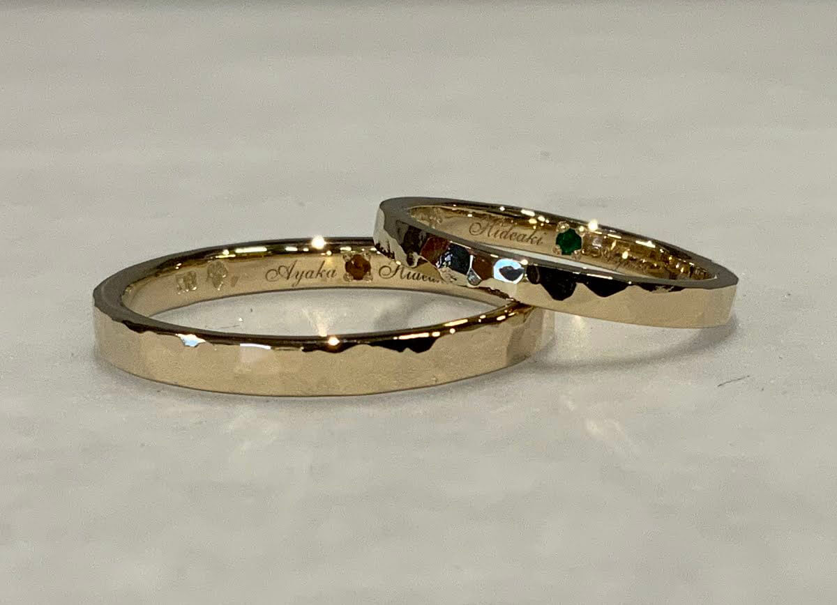 The rings are matching champagne gold with a hammered pattern. The width was chosen to fit each finger.