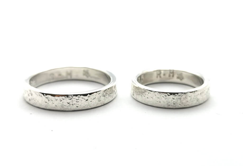 This customer had a pair of rings made with a texture called snowflake.