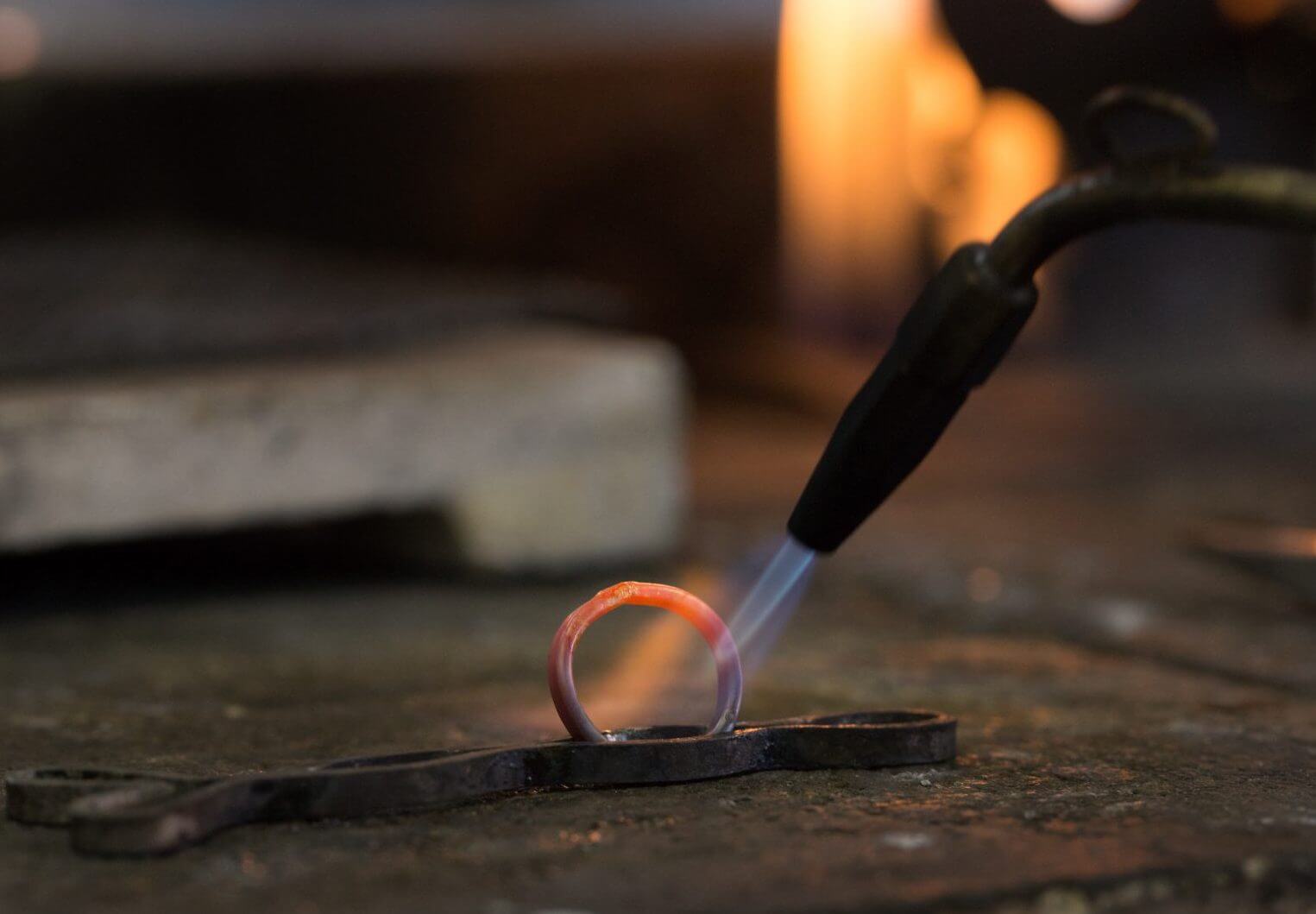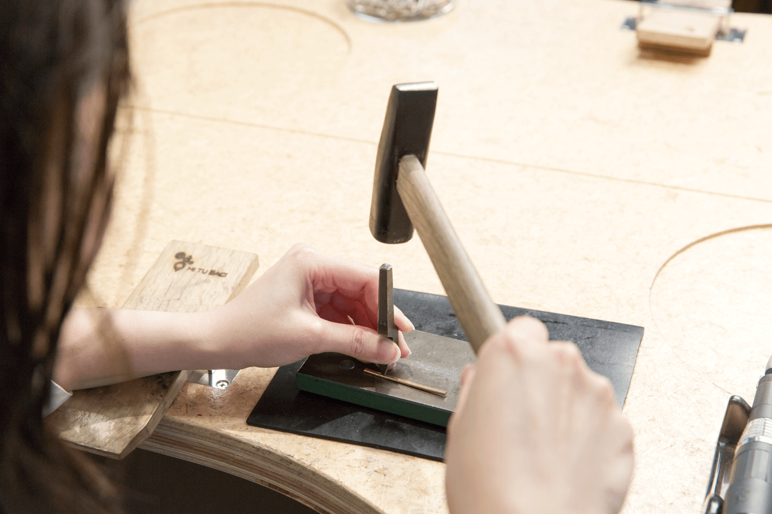 MITUBACIのほかの手作り指輪コースと同様、婚約指輪に自らの手で名前、記念日などを無料で文字入れすることが可能です。鉄製のスタンプを使ってハンマーで直接文字を打ち込む「手打ち刻印」と、専用の機械を使ってゆっくりと文字を彫っていく「機械彫り」の2つからお選びいただけます。