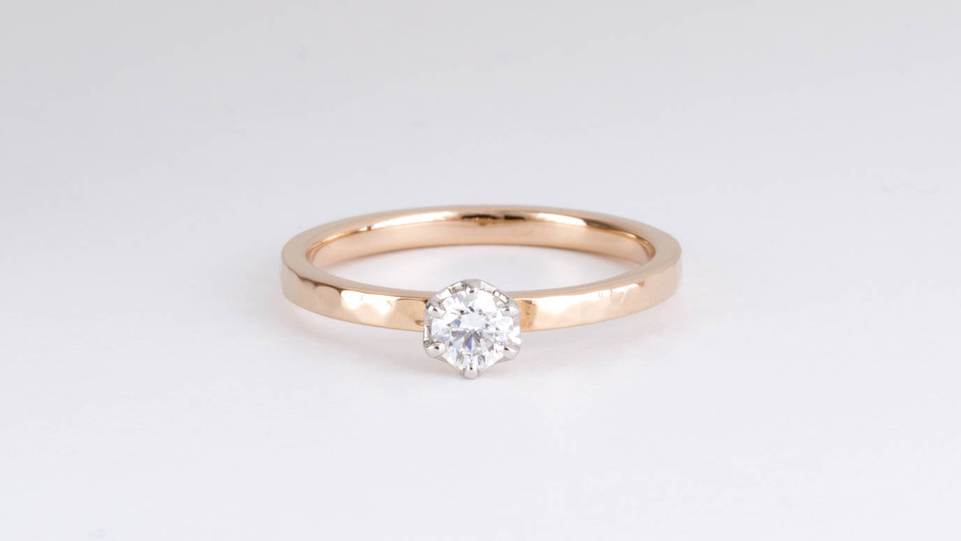 シャンパンゴールドにダイヤモンドが輝く婚約指輪です。テクスチャにはフォレスタという槌目をお選びいただきました。イタリア語で森という意味のテクスチャは手作りならではの質感が楽しめる指輪が作れます。
