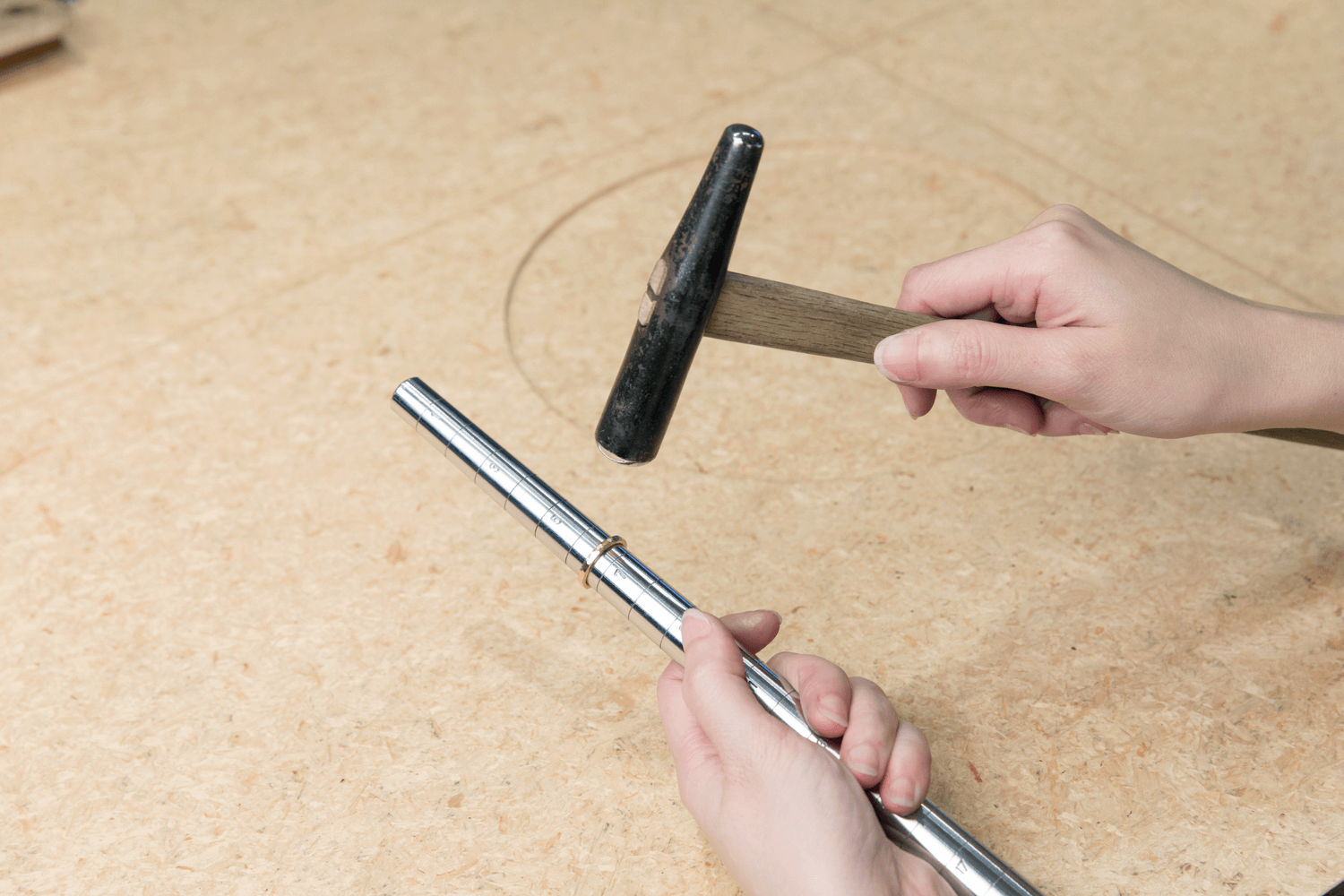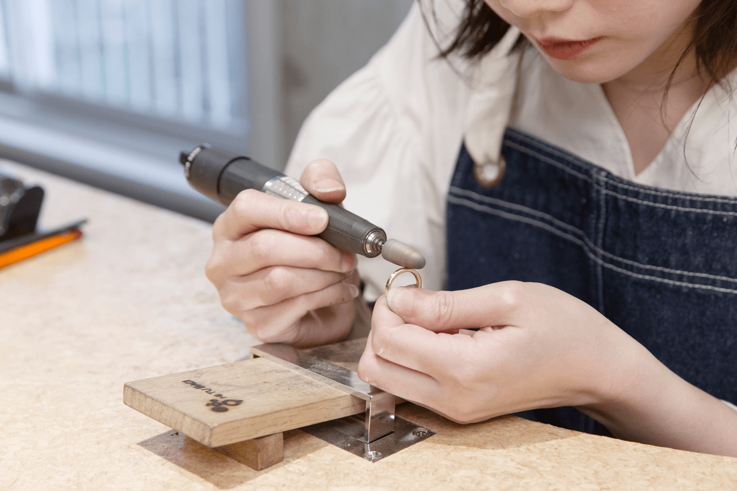 MITUBACIでは、指輪にご本人自ら文字入れを無料でおこなえます。本番前に練習もしますし、ちょっとした修正は職人がお手伝いします。それでも心配な場合は彫刻機械による機械刻印(無料)やレーザー機で刻印するオプションもありますのでお気軽にご相談ください。