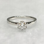 槌目を打ったリングは光がリズミカルに返ってきます。きらきら光る指輪の上にはより輝くダイヤモンドが留められています。シンプルなストレートの指輪ですので、1本でも結婚指輪との重ね付けでも、その日の気分で楽しめます。