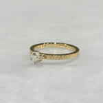 大きな0.3ctのダイヤモンドが輝く婚約指輪です。イエローゴールドをつや消し(ブラスト)したシンプルな造形ですなので、ストレートの結婚指輪との重ね付けもおすすめです。