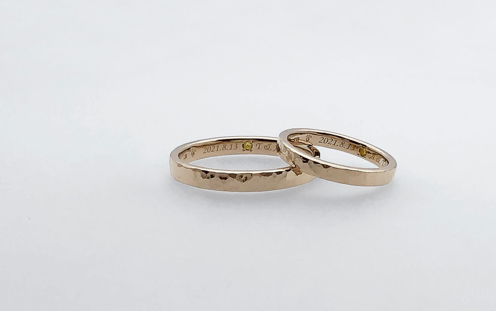 MITUBACIオリジナル、人気のシャンパンゴールドで作った槌目の結婚指輪です。内側にもお揃いで8月の誕生石・ペリドットが留められています。文字はレーザーで、ぱきっとした文字が彫られています。手作り結婚指輪でも、レーザー刻印と石留(宝石を留める作業)は職人が作業いたします。お揃いの誕生石の入った槌目の結婚指輪槌目の結婚指輪(写真左) 槌目 K18シャンパンゴールド 誕生石 レーザー刻印 幅3.0mm ¥115,500槌目の結婚指輪(写真右) 槌目 K18シャンパンゴールド 誕生石 レーザー刻印 幅2.5mm ¥93,500() ¥ 投稿ナビゲーション氷のような質感の2つの指輪を結婚指輪にシンプルなプラチナの結婚指輪