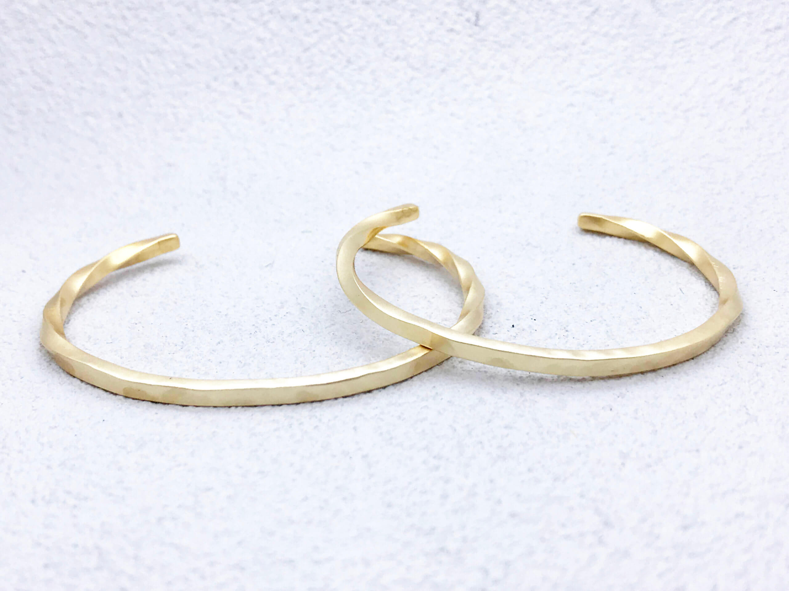 つや消しをしてからイエローゴールドのメッキをかけたバングルです。マットゴールドがおしゃれなおそろいバングルです。両端のねじったところがアクセントになっていいですね。ねじる作業もお客様が行いますので、ご自身の好みでお作りください。つや消しされたマットゴールドのバングル槌目ブラストのバングル(写真左) 槌目ブラスト シルバー 手打ち刻印 ¥18,700槌目ブラストのバングル(写真右) 槌目ブラスト シルバー 手打ち刻印 K18イエローゴールドメッキ ¥18,700() ¥ 投稿ナビゲーションアイスブルーダイヤモンドが輝く、槌目のペアリングガーネットの入った槌目のプラチナ手作り結婚指輪