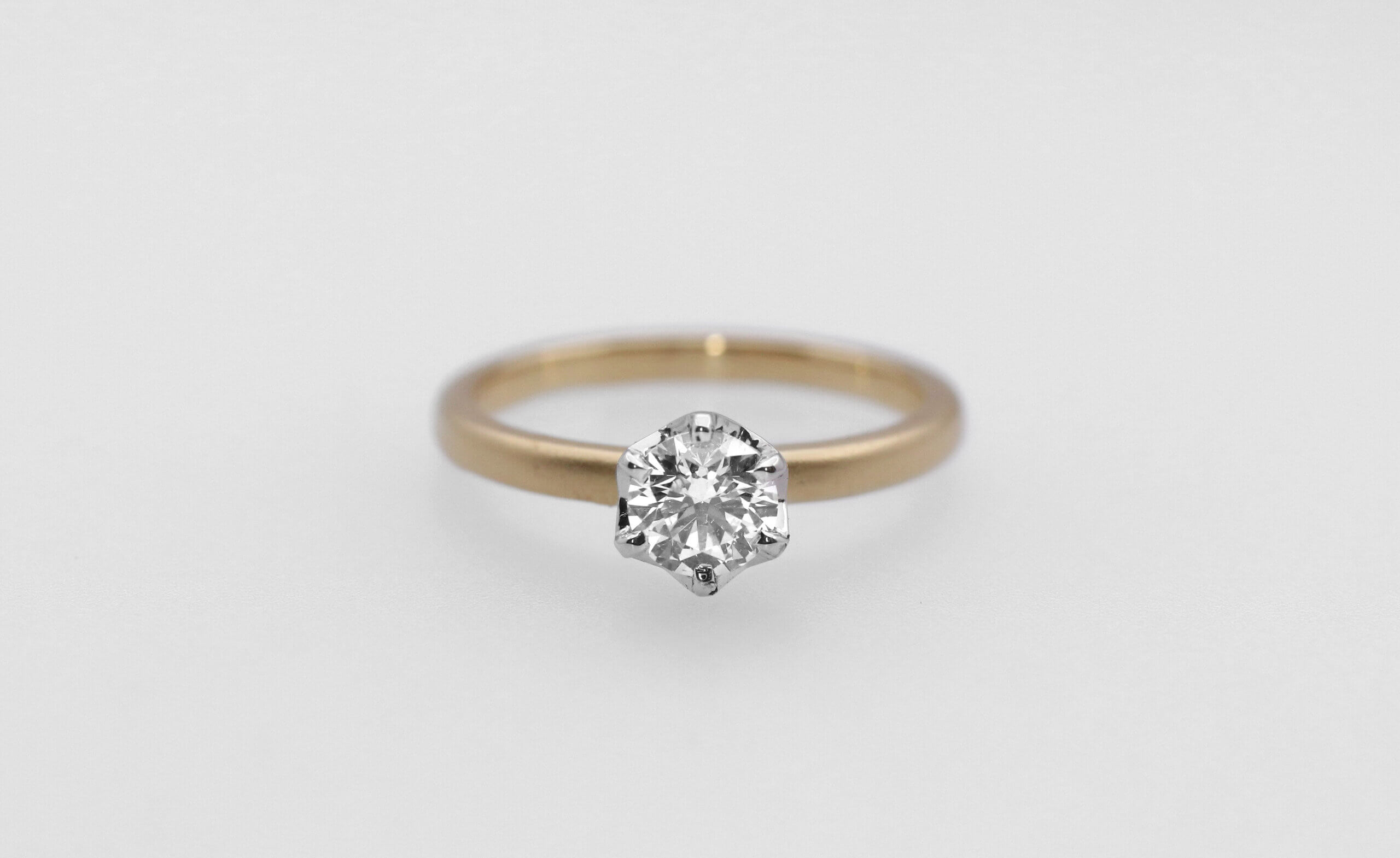 つや消ししたイエローゴールドに映えるダイヤモンドの婚約指輪