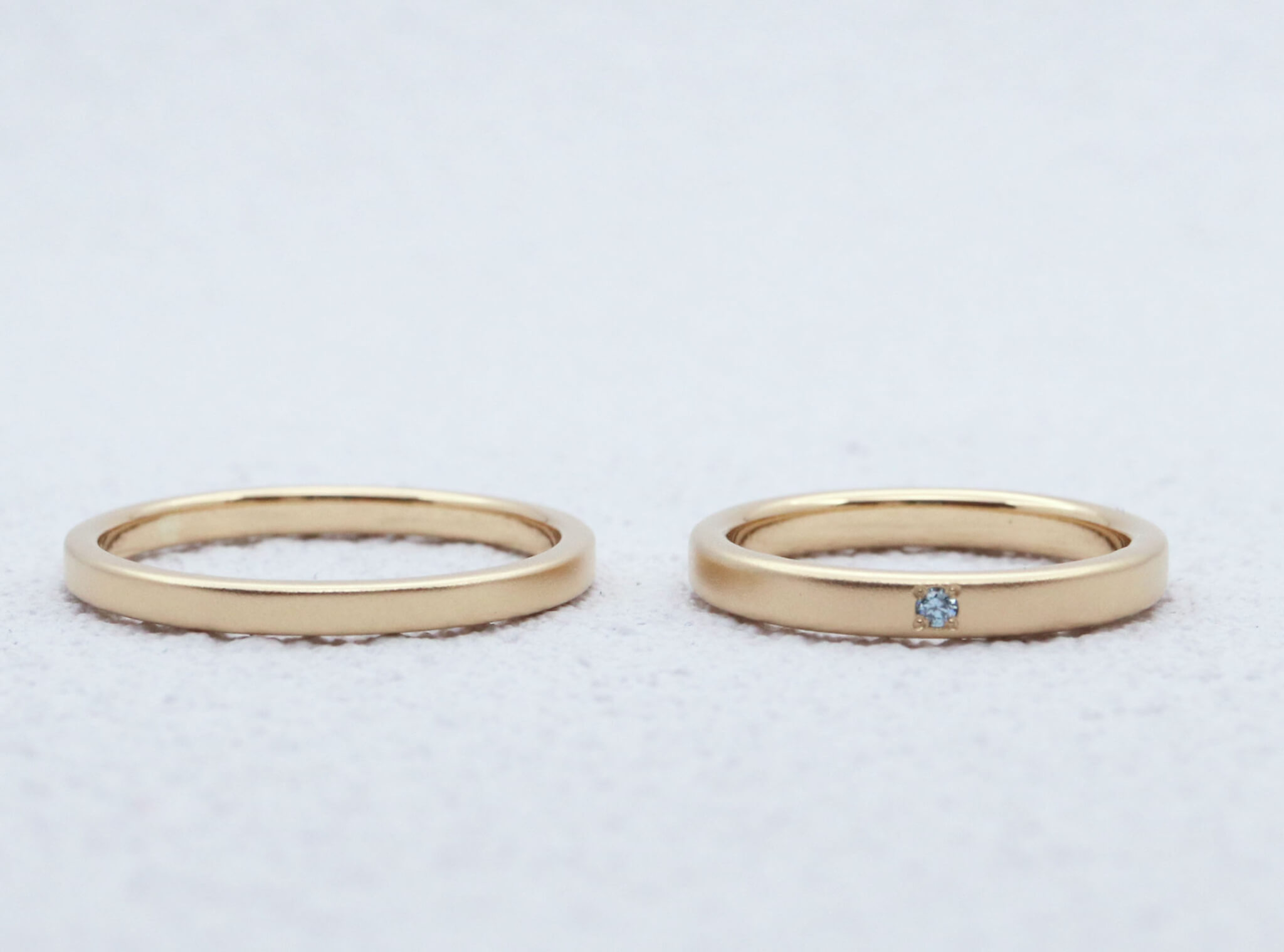 イエローゴールドは、つや消しするとまた違った魅力があります。つや消しされたイエローゴールドのやさしい色合いに、アイスブルーダイヤがよく映え、美しいリングになりました。つや消しイエローゴールドにアイスブルーダイヤプレーン(ブラスト)の結婚指輪(写真左) プレーン K18イエローゴールド 手打ち刻印 幅2.0mm ¥66,000プレーン(ブラスト)の結婚指輪(写真右) プレーン K18イエローゴールド ダイヤモンドオプション 手打ち刻印 幅2.5mm ¥93,500() ¥ 投稿ナビゲーションつやつやプレーンの結婚指輪婚約指輪のダイヤ、0.2ctと0.5ctを比較するとどう違う?
