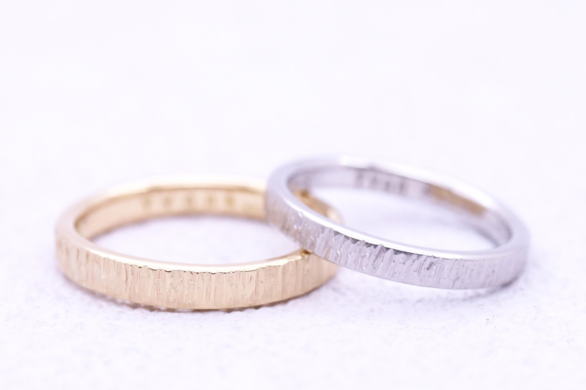 フォレスタはMITUBACIで特別にご用意している槌目もようのひとつです。先の平らな金槌で木立のようなテクスチャを作ることができます。つや消しすることで、またちがった雰囲気のある結婚指輪ができあがります。つや消しフォレスタの素敵な結婚指輪フォレスタの結婚指輪(写真左) フォレスタ K18イエローゴールド 手打ち刻印 幅3.0mm ¥フォレスタの結婚指輪(写真右) フォレスタ プラチナ950 手打ち刻印 幅2.5mm ¥99,000() ¥https://www.stg.mitubaci.co.jp/news/5527/ 投稿ナビゲーションプレーンなプラチナ結婚指輪と槌目のイエローゴールド結婚指輪細身に仕上げたプラチナ槌目の結婚指輪