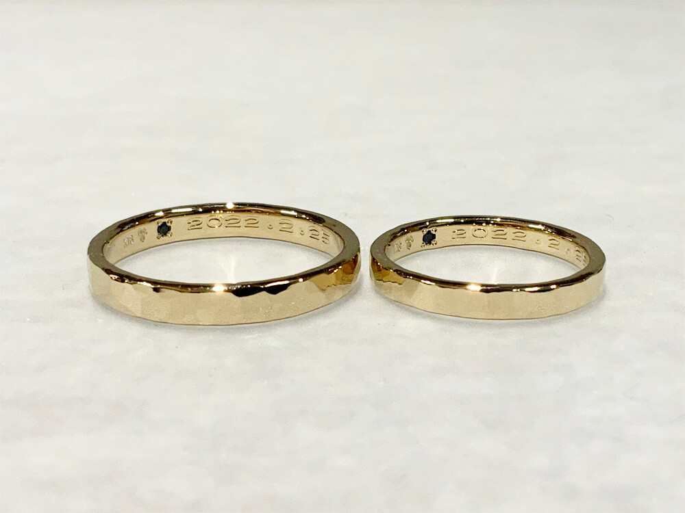 シャンパンゴールドでお作りいただいた槌目の手作り結婚指輪です。リング内側の文字彫りは機械彫りをお選びいただきました。またシークレットストーンとしてブルーサファイアも留めています。シャンパンゴールドで作る槌目の手作り結婚指輪槌目の結婚指輪(写真左) 槌目 K18シャンパンゴールド 誕生石 機械彫り 幅3.0mm ¥115,500槌目の結婚指輪(写真右) 槌目 K18シャンパンゴールド 誕生石 機械彫り 幅2.5mm ¥93,500() ¥ 投稿ナビゲーション手書きイラストの入った手作りプラチナ結婚指輪存在感のある幅広の手作りバングル