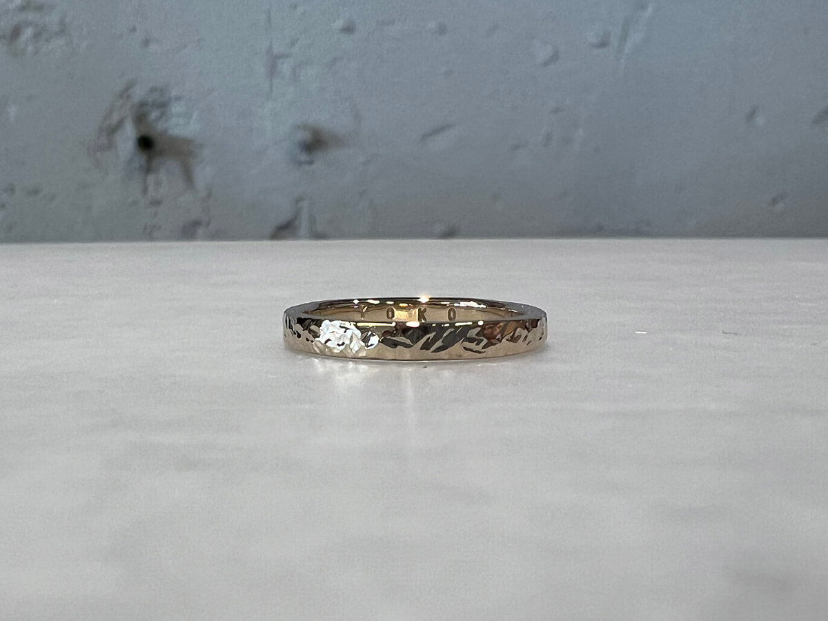 ステラという仕上げで作ったシャンパンゴールドリングです。ステラはイタリア語で星という意味です。星のようにきらきらと輝く指輪ができました。ステラ仕上げのシャンパンゴールドリングステラのリング() ステラ K18シャンパンゴールド 手打ち刻印 幅2.5mm ¥77,000() ¥() ¥ 投稿ナビゲーションお互いの名前をレーザー刻印で刻む・シャンパンゴールドの手作り結婚指輪サイドにラインを入れたプラチナリング