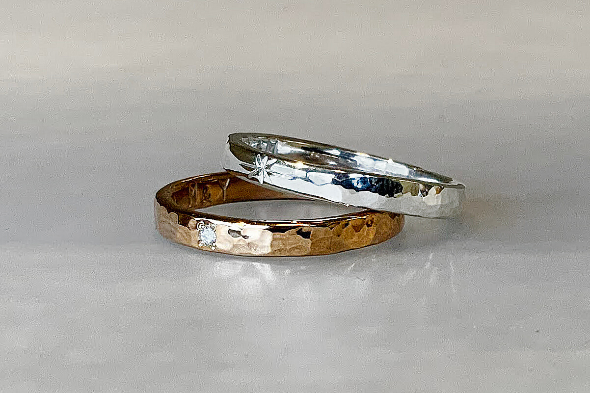 2つとも槌目を打ったシルバーリングです。左側の指輪はK18ピンクゴールドメッキに加工をし、ダイヤモンドを1石留めたことで、可愛らしい雰囲気の指輪になりました。どちらも内側に誕生石が留めてあります。みえないところのおしゃれもすてきです。ダイヤモンドを留めたピンクゴールドメッキのシルバーリングピンクゴールドメッキ・槌目のシルバーリング(写真左) 槌目 シルバー ダイヤモンドオプション, 誕生石 手打ち刻印 幅2.8mm K18ピンクゴールドメッキ ¥41,800槌目のシルバーリング(写真右) 槌目 シルバー 誕生石 手打ち刻印 幅2.8mm ¥22,000() ¥ 投稿ナビゲーション雰囲気のあるシャンパンゴールドにダイヤモンドが映える婚約指輪ピンクゴールドで作る槌目の結婚指輪