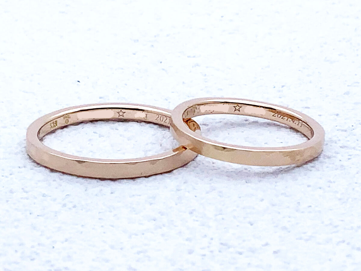 ピンクゴールドの結婚指輪に槌目を打ち、それからつや消しを施した手作り結婚指輪です。