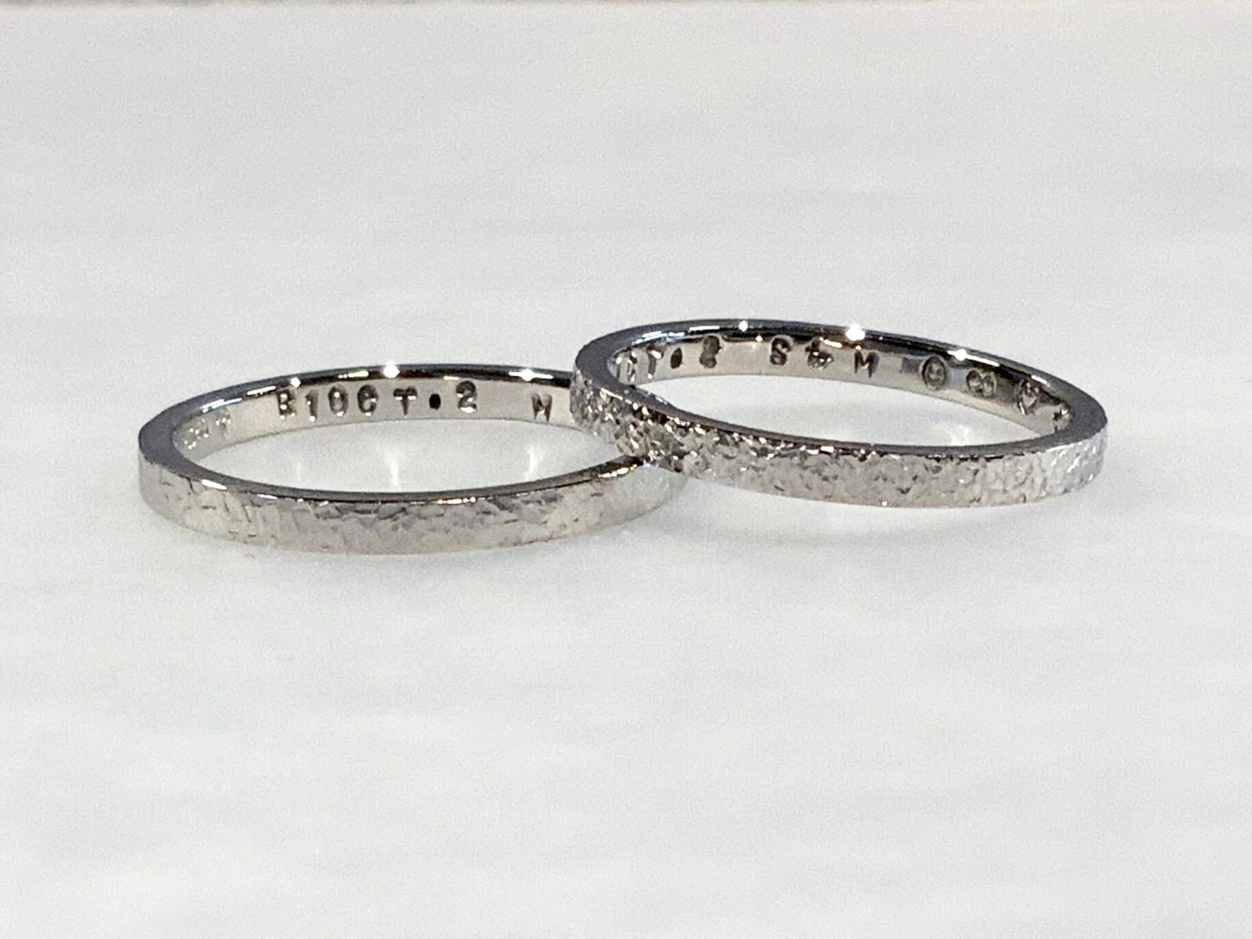 左の指輪はつや消しを施したフロストという名前を付けた槌目模様の指輪です。氷の表面のようなテクスチャが作れるMITUBACIオリジナルの模様です。プラチナで作り、さらにつや消しをすることでより氷のような質感が味わえます。右の指輪はスノーフレークという、降り積もった雪の表面のようなテクスチャが作れる、こちらもMITUBACIオリジナルの模様です。プラチナを使うことでより雪のようなイメージがかきたてられます。