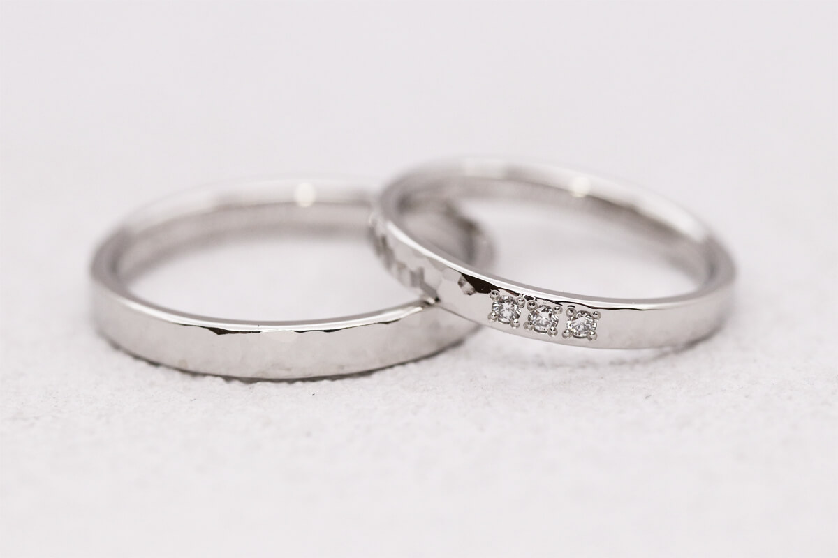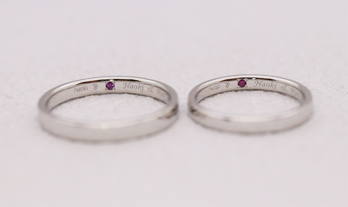 おそろいのシークレットストーン:ルビーが留まった美しい槌目の手作り結婚指輪です。文字彫りはレーザー文字彫りをお選びいただきました。宝石を留める作業とレーザー文字彫りは職人が作業いたします。ご自身で文字を打ちたい場合は「手打ち刻印」をお選びください。 プラチナにダイヤモンドが3石輝く槌目の手作り結婚指輪槌目の結婚指輪(写真左) 槌目 プラチナ950 誕生石 レーザー刻印 幅3.0mm ¥121,000槌目の結婚指輪(写真右) 槌目 プラチナ950 ダイヤモンドオプション, 誕生石 レーザー刻印 幅3.0mm ¥170,500() ¥https://www.stg.mitubaci.co.jp/news/7264/ 投稿ナビゲーションお互いに好きな幅で作るカラーゴールドの槌目手作り結婚指輪大好きなアーティストとおそろいのゴールドリング