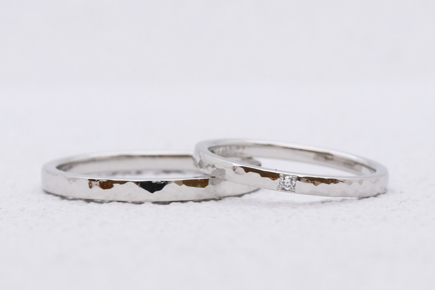 右の指輪は、ダイヤモンドが槌目で輝きを増したプラチナに負けることなく、美しく光っています。左の指輪の内側にもダイヤモンドが留まっています。人から見えるところに宝石を留めるのをためらったり、キズが心配な方は、内側にお揃いの宝石を留めてもいいですね。左の指輪は、半分だけブラストというつや消しの加工を施しています。その日の気分によって、テクスチャを変えることができる指輪になっています。プラチナ結婚指輪・槌目模様にダイヤモンドがアクセント槌目の結婚指輪(写真左) 槌目ブラスト プラチナ950 ダイヤモンドオプション レーザー刻印 幅2.0mm ¥88,000槌目の結婚指輪(写真右) 槌目 プラチナ950 ダイヤモンドオプション レーザー刻印 幅1.7mm ¥81,400() ¥https://www.stg.mitubaci.co.jp/news/5796/ 投稿ナビゲーションアクアマリンとアメシストのペアリング手打ち刻印がかわいい、シャンパンゴールドで作った槌目の結婚指輪