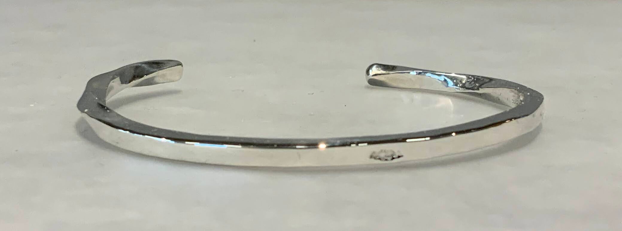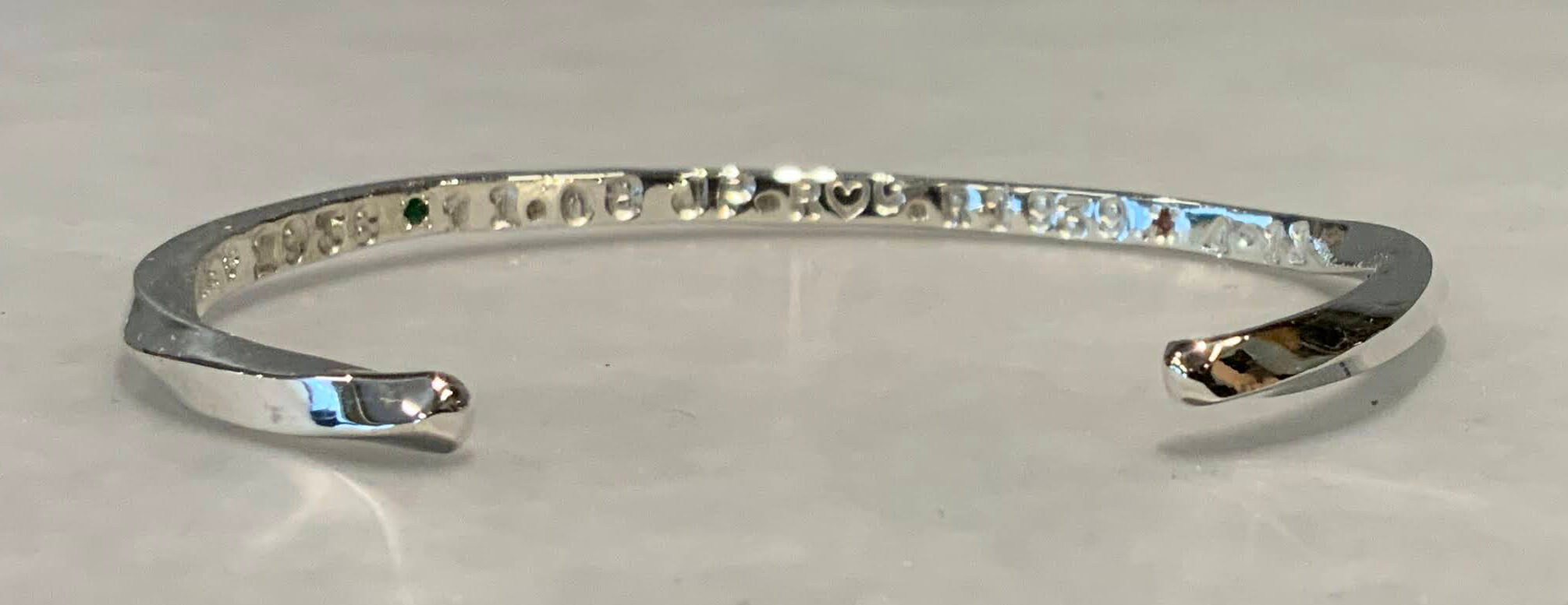 外側は刻印は少なく、シンプルにプレーンに仕上げた角線のシルバーバングルです。内側にはおじいさま・おばあさまの思い出をたくさん打ち込みました。誕生石もお2人にちなんだ宝石が2石留められています。外側はシンプルに、内側には誕生石や刻印をたくさん入れた手作りシルバーバングル角線の手作りシルバーバングル(写真中央) ツイスト シルバー 誕生石 手打ち刻印 幅3.0mm ¥37,400() ¥() ¥ 投稿ナビゲーションピンクゴールドにミル打ちの入った手作り婚約指輪シャープなリングにダイヤモンドが輝く手作り婚約指輪