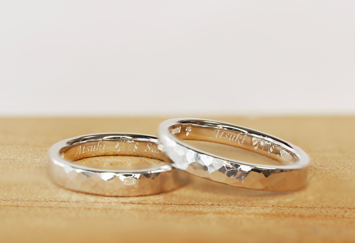 内側に、手書きイラストとお名前をレーザー刻印した、プラチナの手作り結婚指輪です。サインペンで描いていただいたイラストをメールであらかじめ送っていただき、ご来店いただいた日に作った指輪にレーザーで刻印しました。イラストだけでなく、手書き文字も同様に刻印することができます。ご来店いただいた際に書いていただき、そちらからデータを作成することもできます。※ご希望の方は、メールにてお問合せいただけますとご案内がスムーズです。手書きイラストの入った手作りプラチナ結婚指輪槌目の結婚指輪(写真左) 槌目 プラチナ950 レーザー刻印 幅3.0mm ¥107,800槌目の結婚指輪(写真右) 槌目 プラチナ950 レーザー刻印 幅3.0mm ¥107,800() ¥ 投稿ナビゲーション2つのテクスチャが楽しめるシャンパンゴールドの手作り結婚指輪シャンパンゴールドで作る槌目の手作り結婚指輪