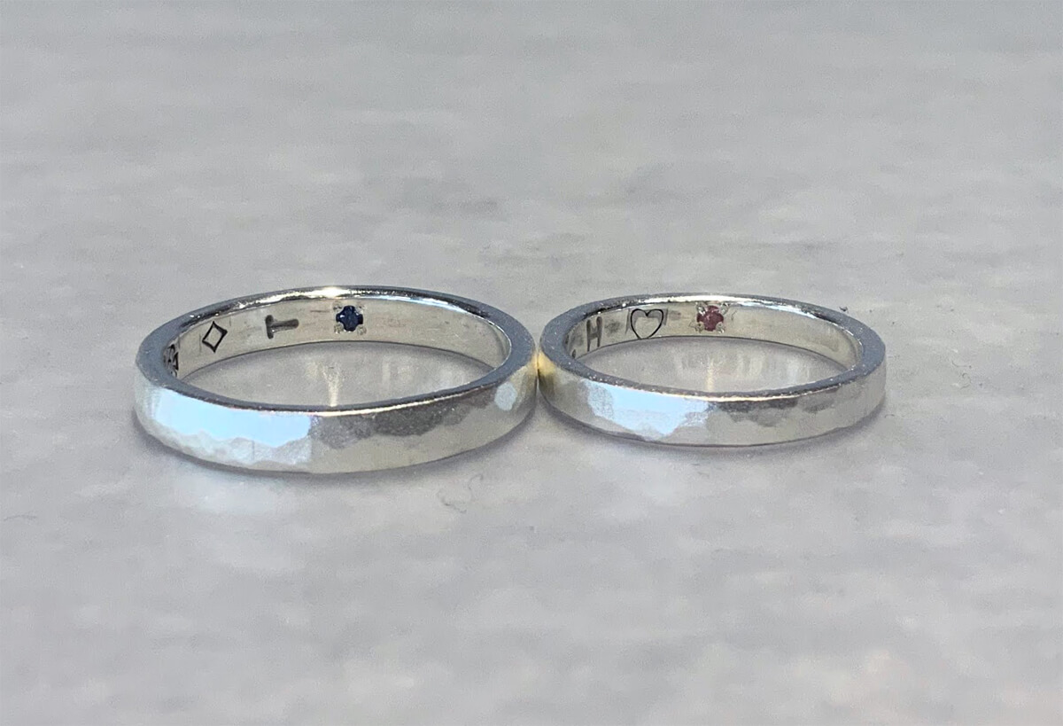 ブルーサファイアとピンクトルマリンがそれぞれ内側に留められたシルバーペアリングです。表面は槌目をつや消ししたテクスチャでお揃いです。幅はそれぞれお似合いの幅をお選びいただきました。誕生石は表に留めることもできます。当日お持ち帰りいただけますので、ぜひご検討ください。誕生石を留めたつや消し手作りシルバーペアリング槌目ブラストのシルバーリング(写真左) 槌目ブラスト シルバー 誕生石 手打ち刻印 幅3.3mm ¥27,500槌目ブラストのシルバーリング(写真右) 槌目ブラスト シルバー 誕生石 手打ち刻印 幅2.8mm ¥22,000() ¥ 投稿ナビゲーション槌目の手作りシルバーバングル誕生石の入ったシルバーペアリング・ペリドットとタンザナイト