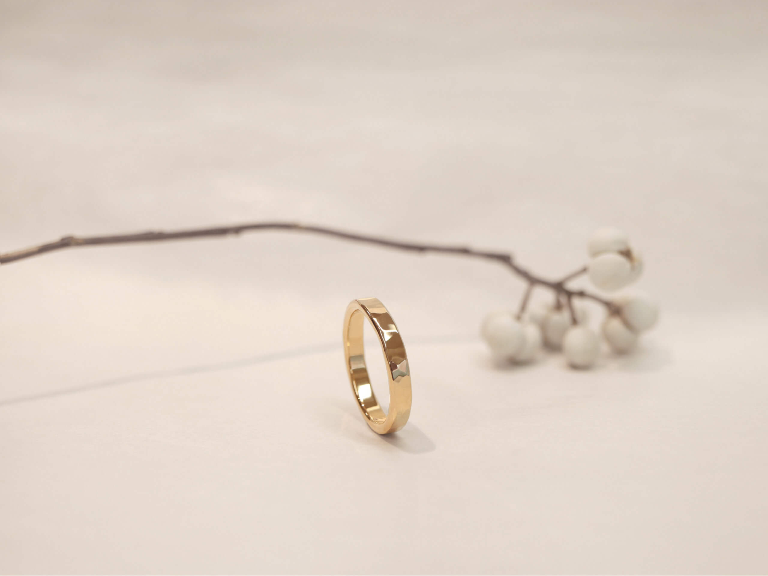 イエローゴールドの槌目の手作り結婚指輪です。槌目を打つことで、きらきらと輝き、イエローゴールドがより華やかな印象になります。