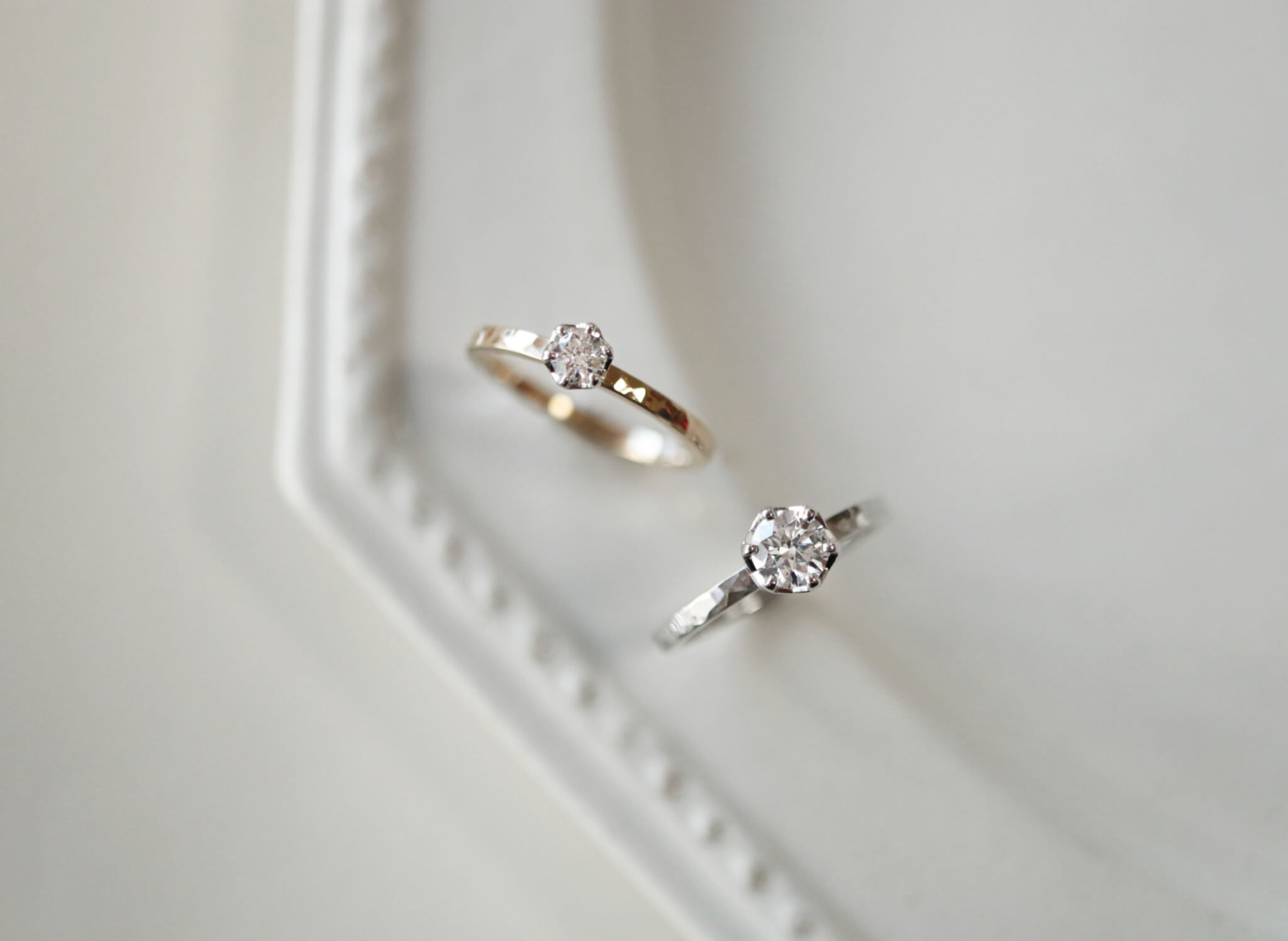MITUBACIの手作り婚約指輪は、基本価格に0.1ctのダイヤが含まれますが、0.2ct、0.3ct、0.5ctなど、より大きなダイヤを使って制作いただくことも可能です。この写真では0.2ctと0.5ctのダイヤの大きさをわかりやすく比較してみました。0.2ctは婚約指輪として標準的なサイズで、パーティーやディナーなどでも自然なアクセントとして幅広くお使いいただけます。0.5ctは平均よりも大きく、リングケースを初めて開けたときにとてもきらびやかな印象になり、ひとたび身につければ、きっと羨望の的になるでしょう。