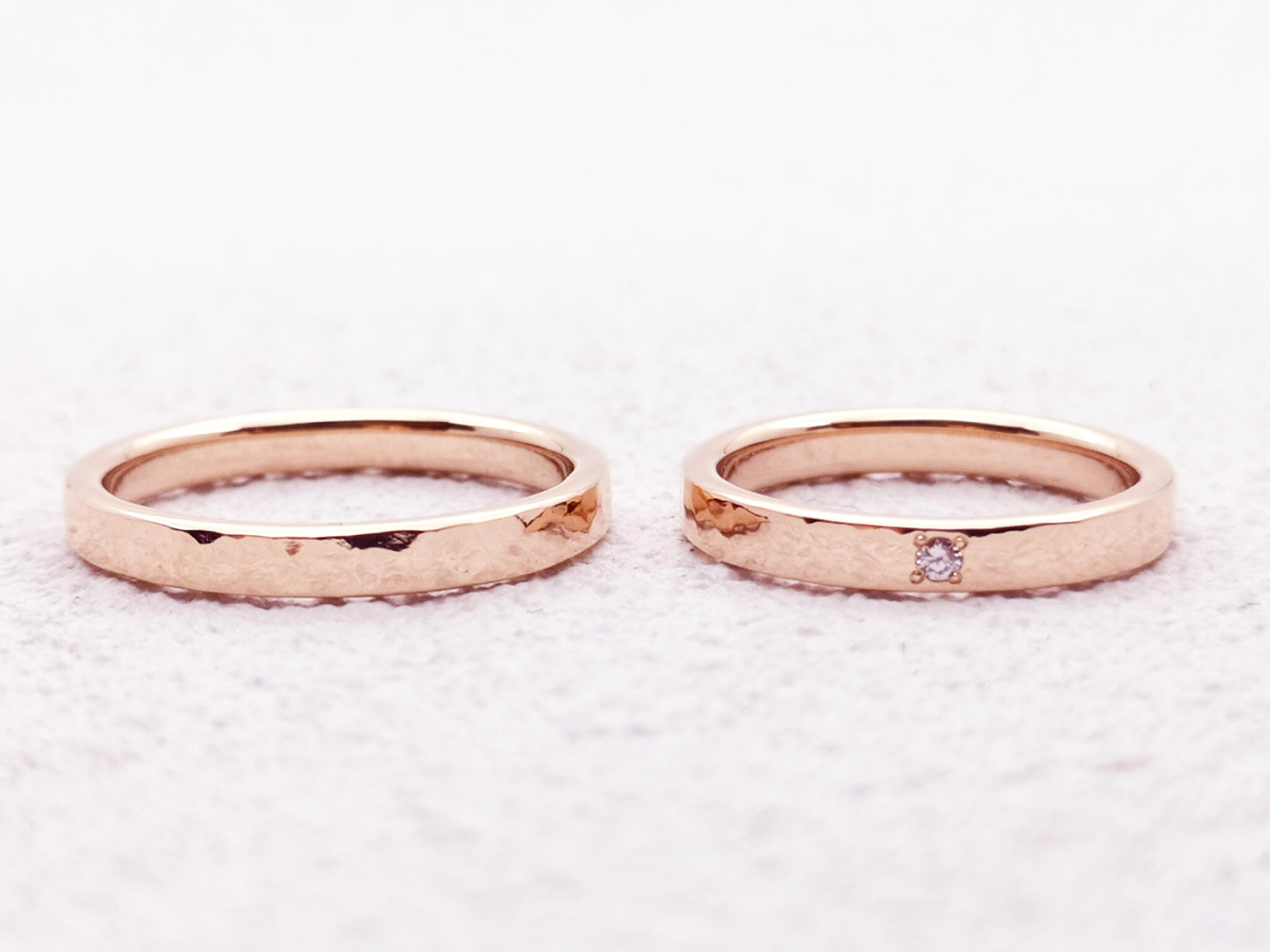 두 사람이 함께 두드린 망치 눈동자에 핑크 다이아몬드가 반짝이는 반지입니다. 망치 눈은 그 자체로도 반짝반짝 빛나는 반지이지만, 다이아몬드는 또 다른 빛깔을 내며 잘 빛나기 때문에 악센트로 추천합니다. 핑크 다이아몬드는 연한 체리색으로, 부드러운 색감을 좋아하는 분들에게 인기 있는 다이아몬드입니다.핑크 골드에 핑크 다이아몬드가 반짝이는 핸드메이드 웨딩 링망치 눈 결혼 반지(1)사진 왼쪽) 망치 무늬 K18 핑크 골드 수제 각인 폭 2.5mm ¥77,000망치 눈 결혼 반지(1)사진 오른쪽) 망치 무늬 K18 핑크 골드 다이아몬드 옵션 수제 각인 폭 2.5mm ¥104,500(1)) ¥ 投稿ナビゲーション오리지널 인그레이빙이 새겨진 플래티넘 핸드메이드 결혼 반지.차분한 분위기의 매트한 느낌의 결혼 반지