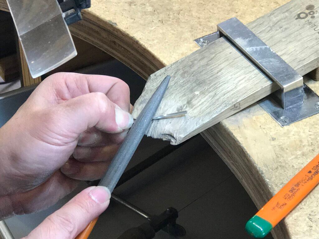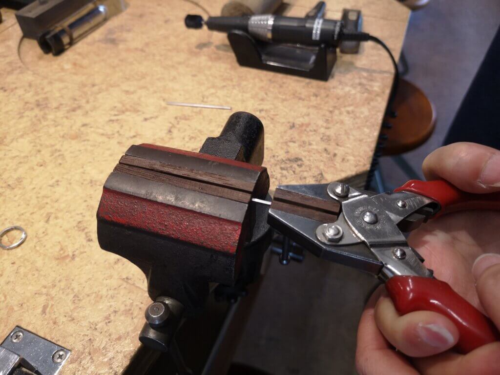 링을 만들기 전 단계에서 수제 결혼반지를 비틀어주는 작업을 한다. 바이스로 재료를 가위로 자르고, 펜치로 천천히 비틀어준다. 이 과정을 통해 리본처럼 아름다운 물결 모양이 만들어진다.
