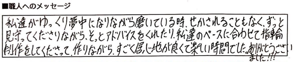 우리가 천천히 몰입하면서 닦고 있을 때, 조급해하지 않고 계속 지켜봐주시면서 부드럽게 조언도 해주시고, 우리의 속도에 맞춰서 반지 제작을 해주셔서, 만드는 동안 정말 편안하고 즐거운 시간이었습니다. 감사합니다!!!