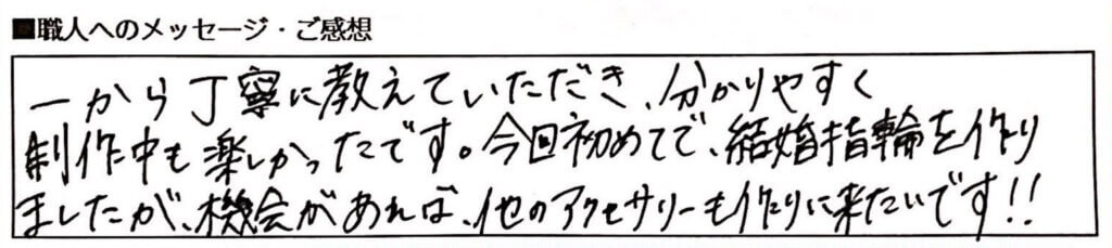 처음부터 친절하게 가르쳐 주셔서 알기 쉽게 제작하는 동안에도 즐거웠습니다. 이번에 처음으로 결혼반지를 만들었는데, 기회가 된다면 다른 액세서리도 만들러 오고 싶어요!!!