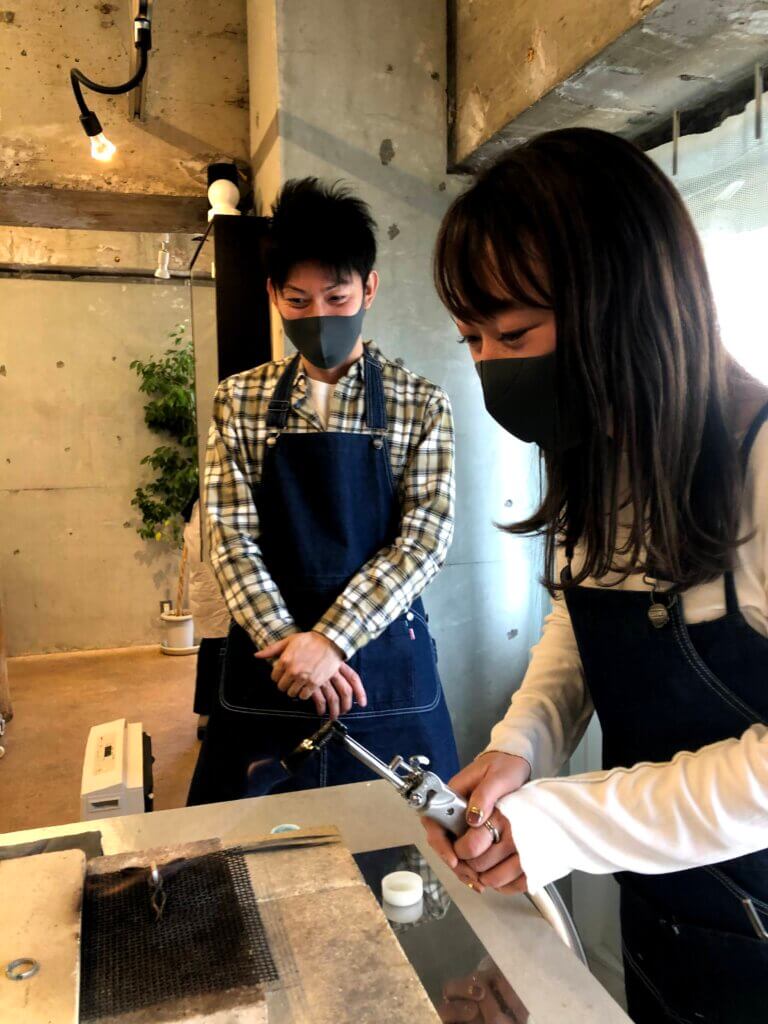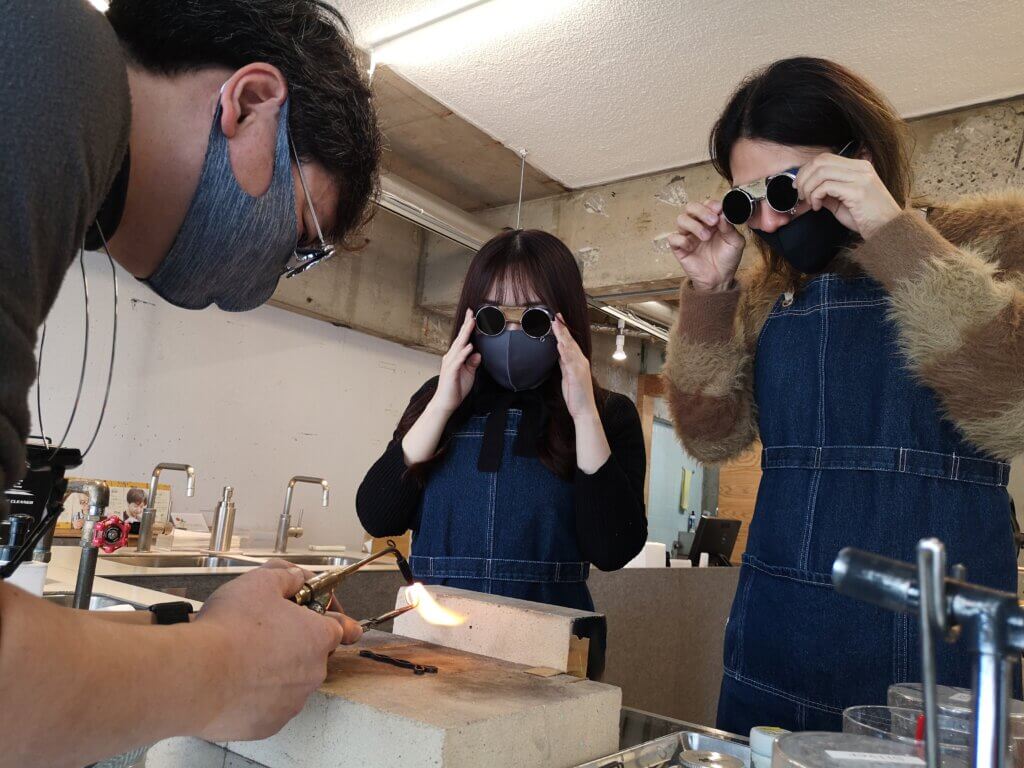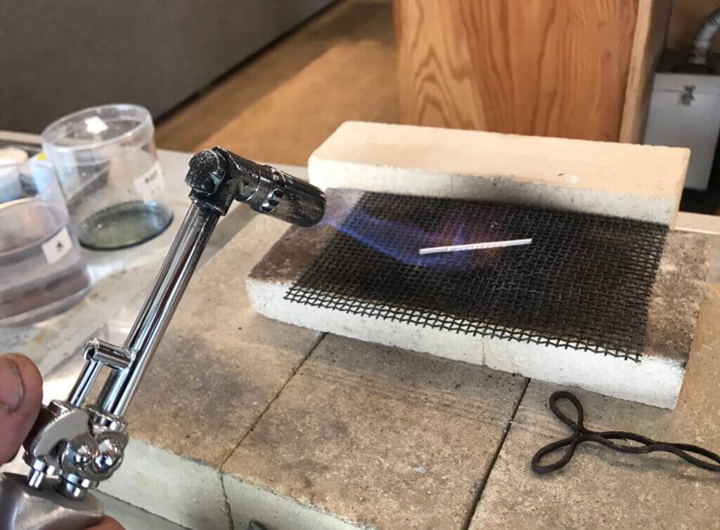 산소 버너를 사용하려면 가스 용접 기술 교육을 받고 자격증을 취득해야 한다. 그래서 백금 납땜은 MITUBACI의 장인이 직접 한다.