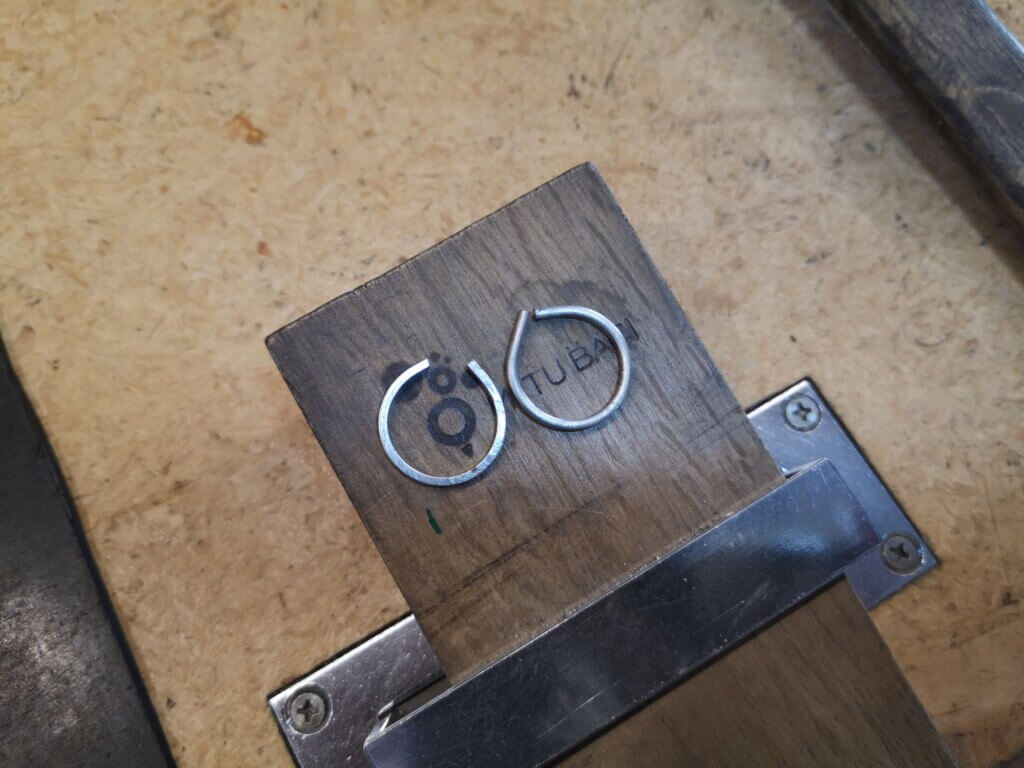 판상 형태였던 재료의 끝과 끝을 용접합니다. 이 작업을 납땜이라고 합니다. 납땜재라는 금속 조각으로 연결합니다. 납땜 재료는 반지 본체와 같은 금속이지만, 본체보다 융점(녹는 온도)이 낮은 금속 조각이다. 이것을 열을 가해 녹여 이음새를 만든다. 모양을 만들 때 타원형이나 삼각형이었다면, 납땜을 한 후 둥근 반지 모양으로 다듬어 나간다.