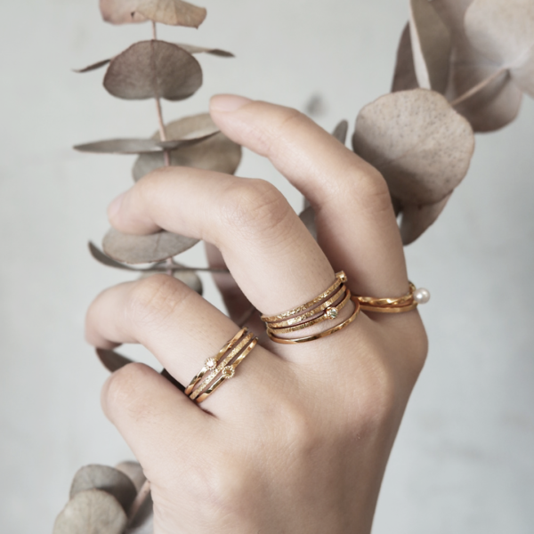シャンパンゴールドに槌目のテクスチャーを付けた結婚指輪。優しい色合いのシャンパンゴールドは、男性・女性とも馴染みやすいゴールドです。