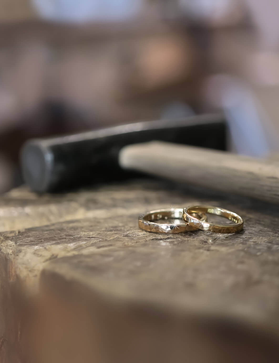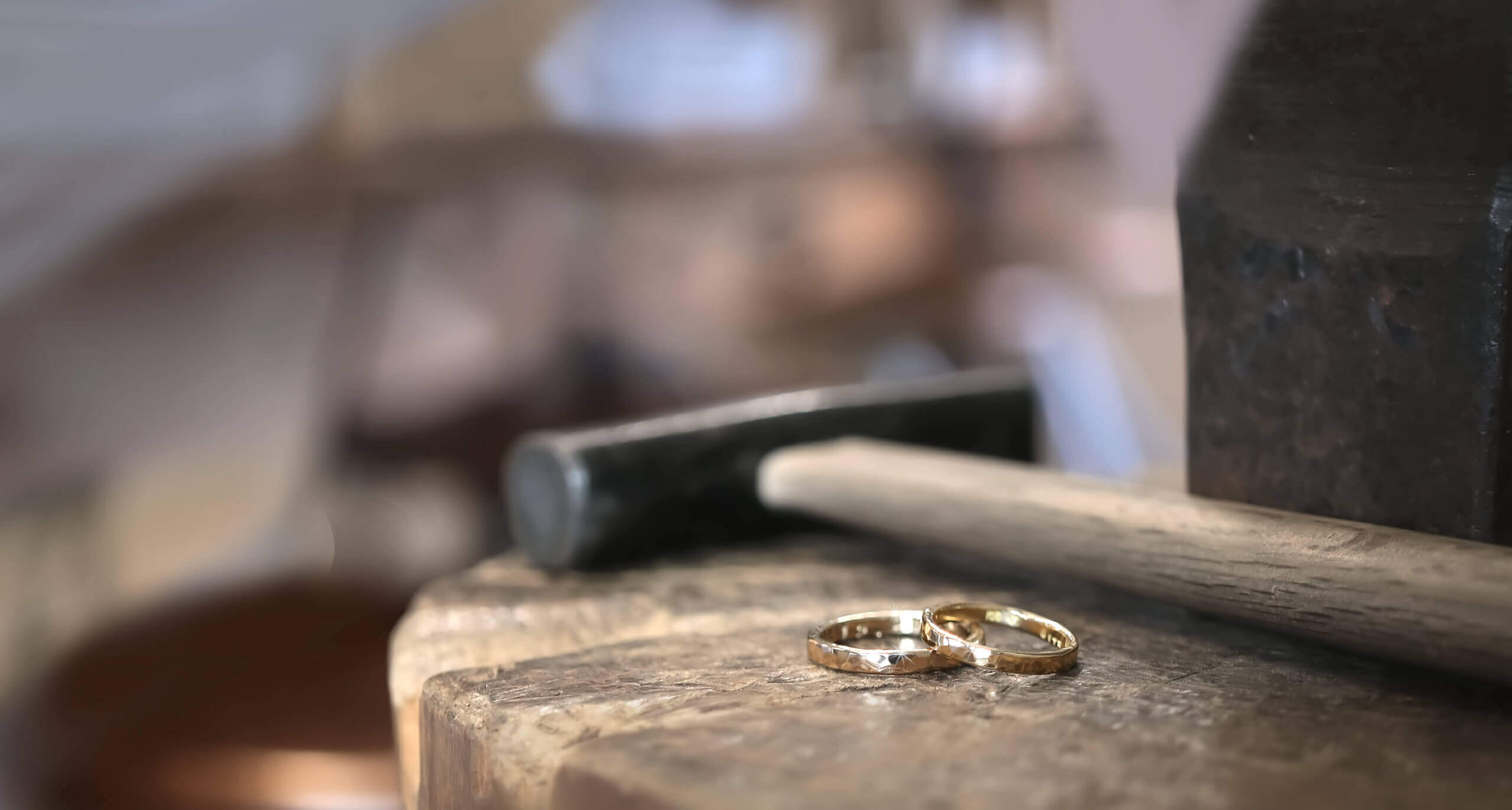 磨いた指輪に鎚目をつけていきます。使うハンマーによって鎚目の模様が変わります。プレーン仕上げをご希望の場合はさらに磨きます。