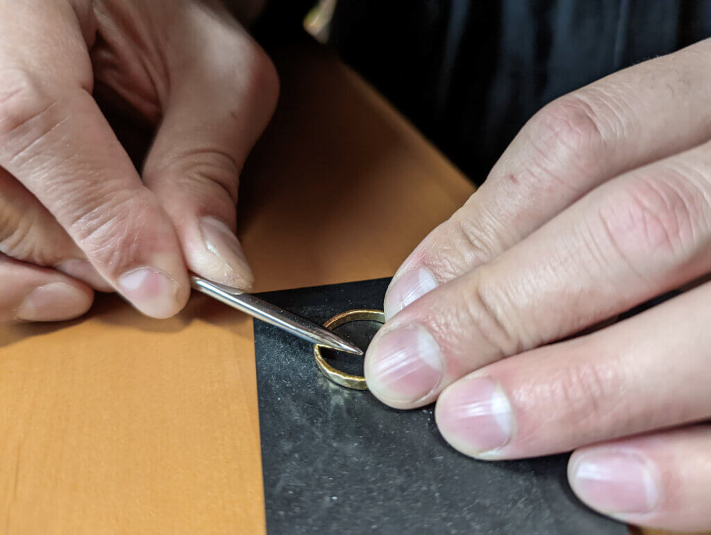 へらを使って、指輪につやを出しているところです。