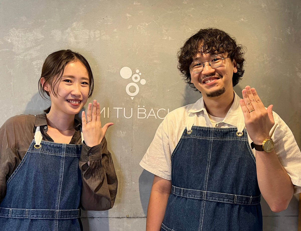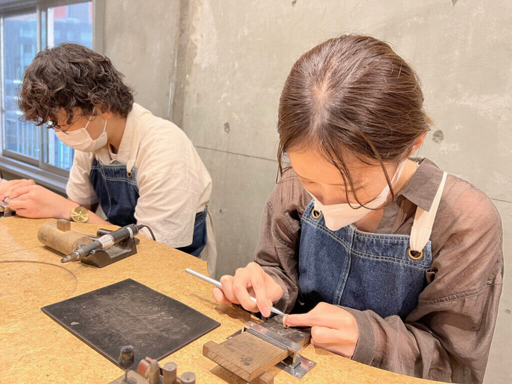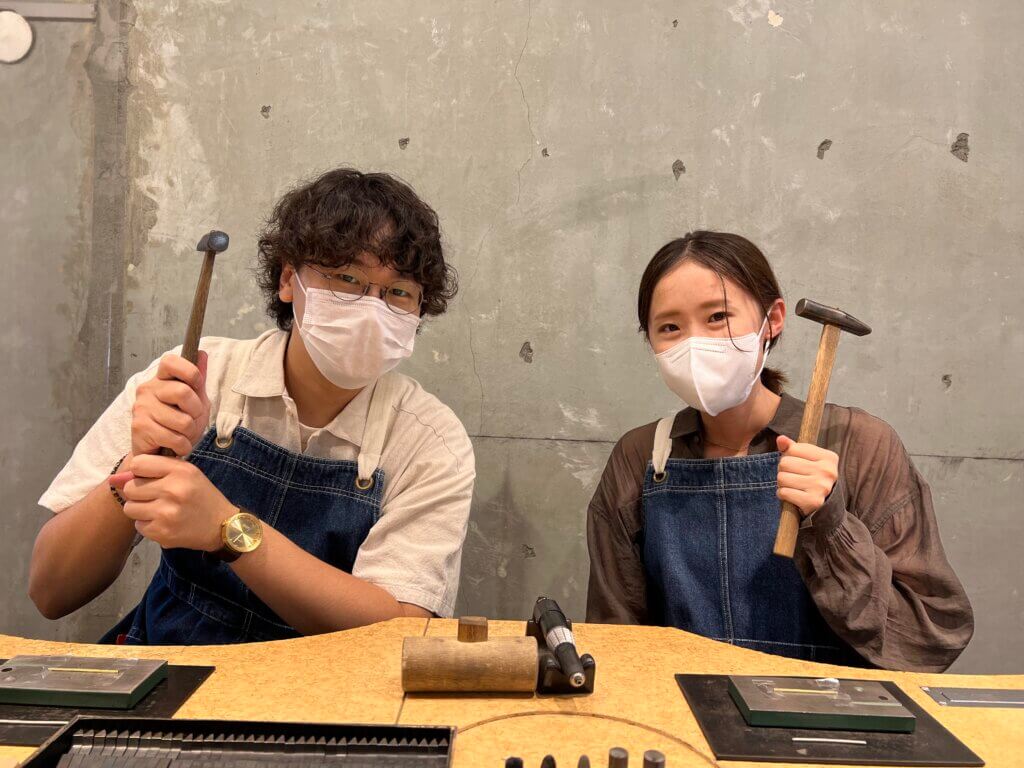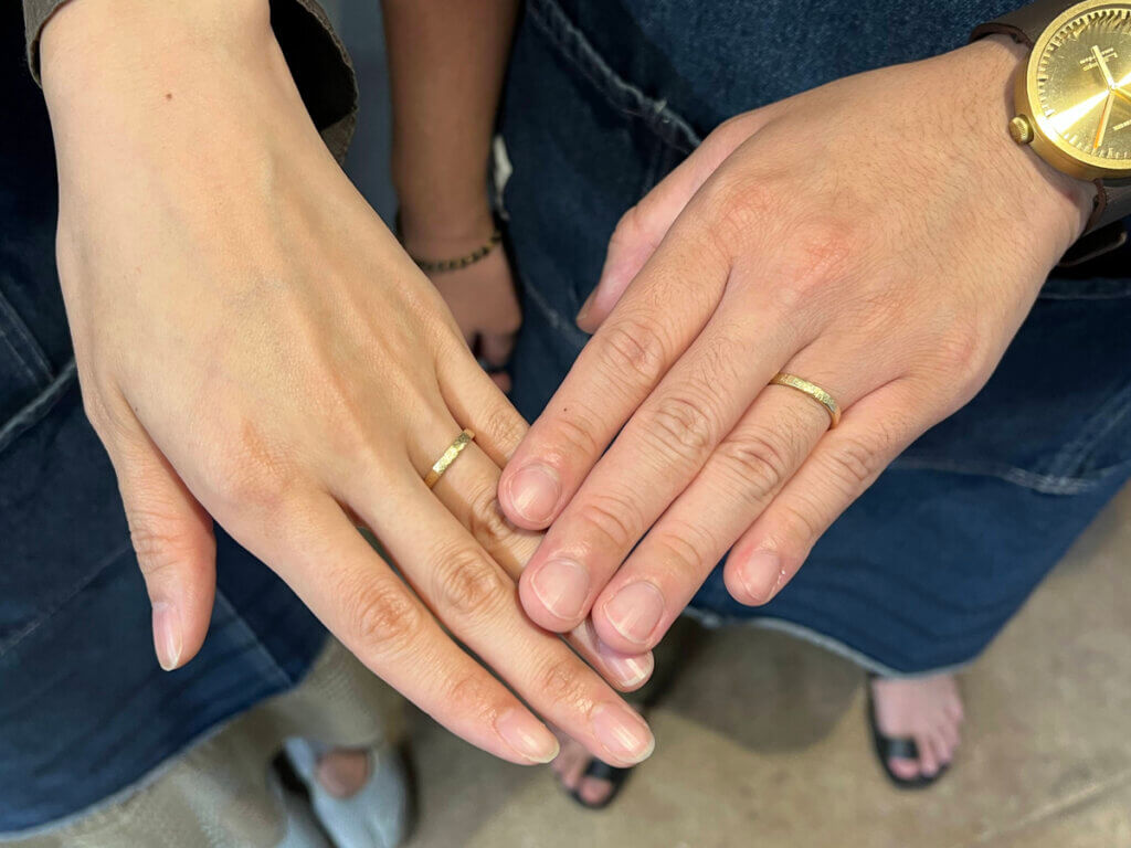 お揃いのイエローゴールドでフロストという種類の槌目の手作り結婚指輪をお作りいただいた埼玉県からご来店いただいたY様ご夫妻です。三軒茶屋がお二人の思い出の地で、自分達で作れるお店をネットで調べていたら丁度MITUBACIをみつけてくださったそうです。