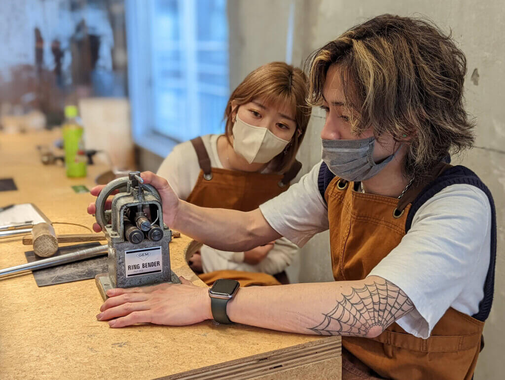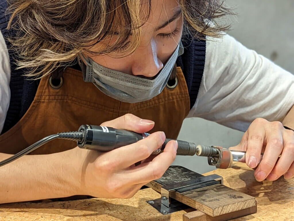 プラチナをロウ付けするバーナーを使う場合は、目の保護のためにメガネを着用します。酸素バーナーは職人作業になりますので、見学してください。K18ゴールドの場合はバーナー作業もお客様に作業してもらいます。