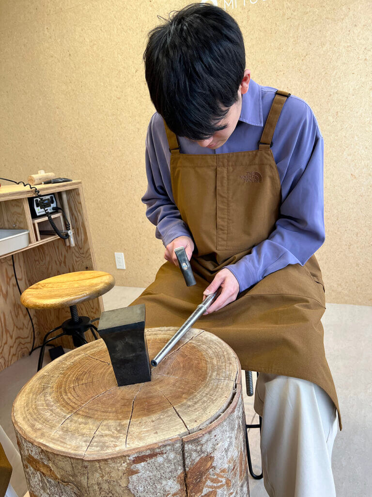 刻印を打ったシルバーの材料を、木槌を使って丸めていきます。