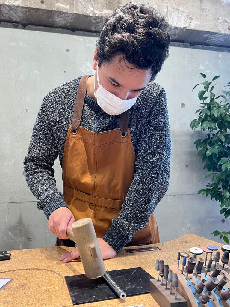 今回は槌目(つちめ)模様ですので、先端が丸くなった金鎚を使用します。