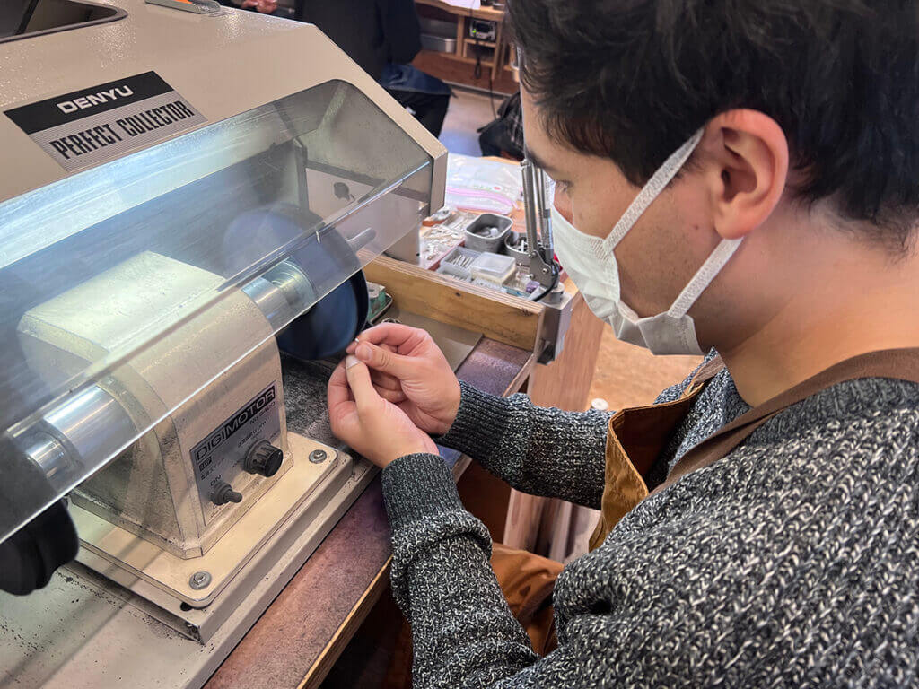 レーザー刻印の場合は、ワークショップは指輪を丸める作業からです。
