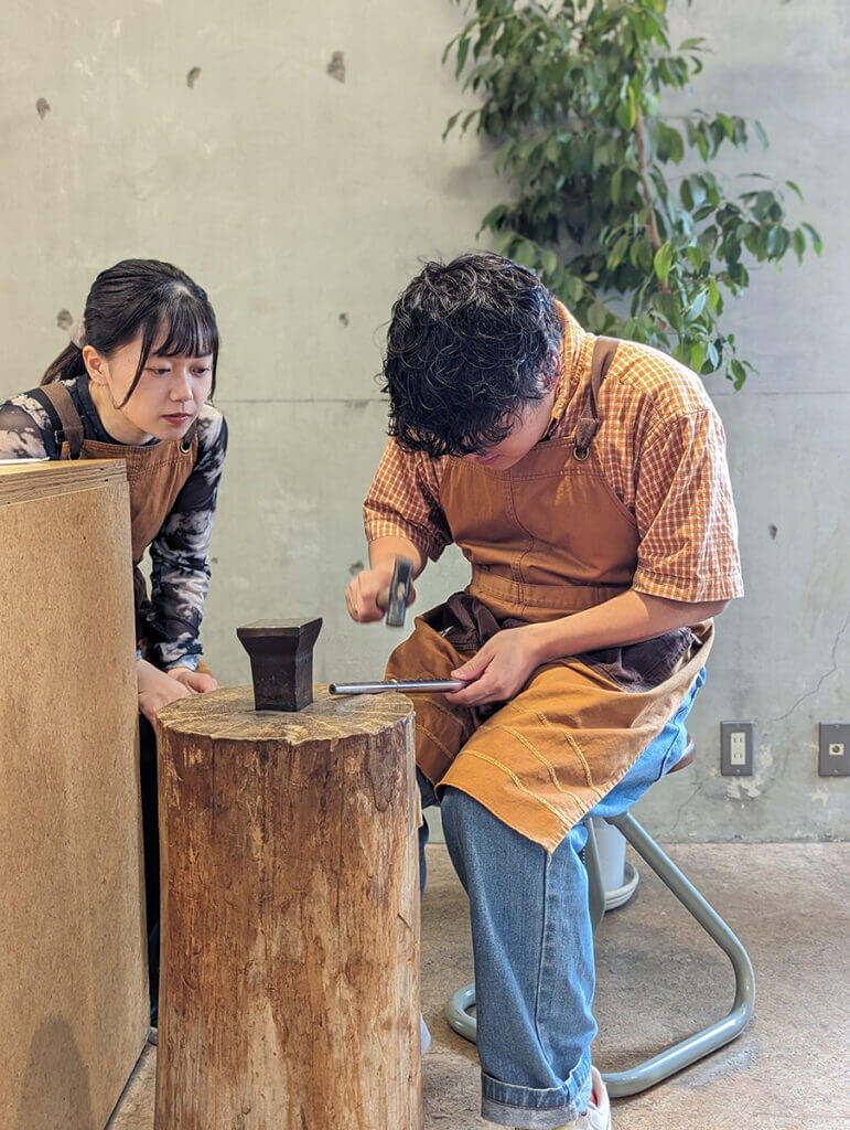 ロウ付け後に磨いて、ハンマーで模様を付けます。