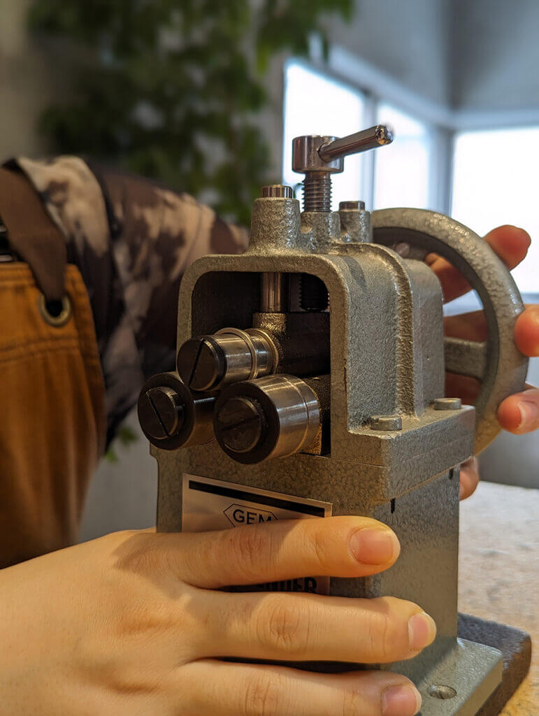 刻印は機械彫りのため、最初の作業は材料のプラチナを丸めます。手作業と、レトロな機械を使います。