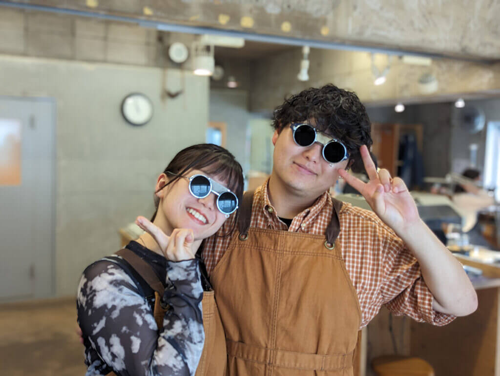 プラチナのロウ付け(溶接)は職人が行うので、遮光眼鏡をかけて見学してもらいます。