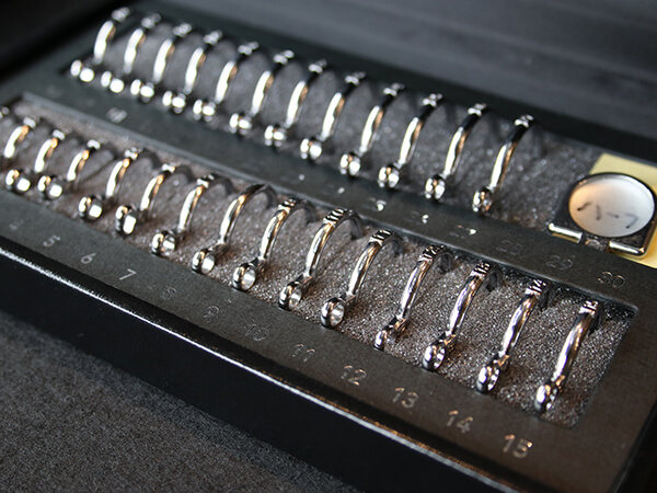また工房の職人が、改良したハーフサイズ(8.5号や12.5号など)のリングサイズも用意しています。そして、スキニーリングなど幅の狭いリング用に職人が手作りした1.5mm幅の極細リングゲージも使用しています。