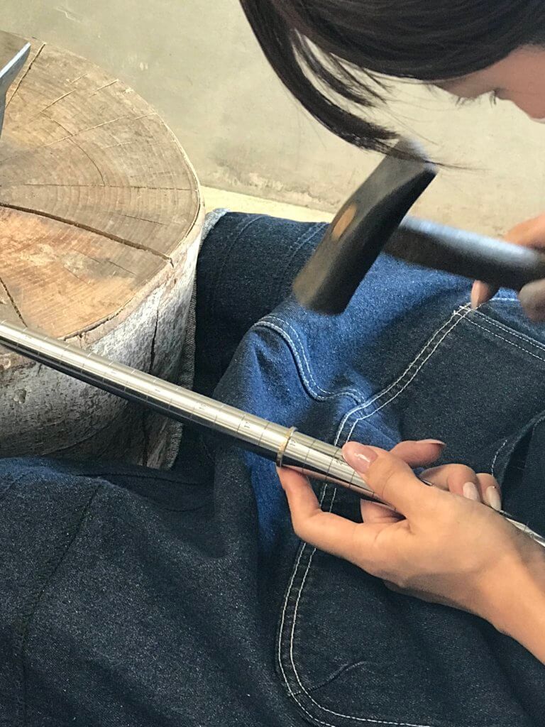 スノーフレークのテクスチャーは、オリジナルの金槌をつかって、指輪を叩いて模様をつけていきます。槌目(つちめ)の種類の1つです。