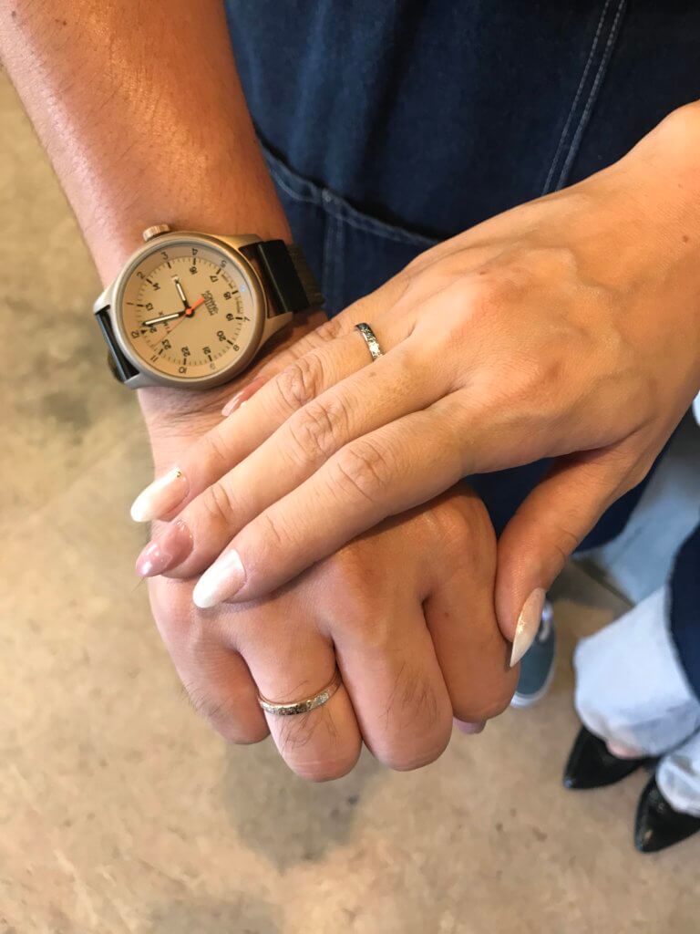 F様は、ペアリングをおつくりということで、それぞれ右手の薬指にはめていらっしゃいました。
