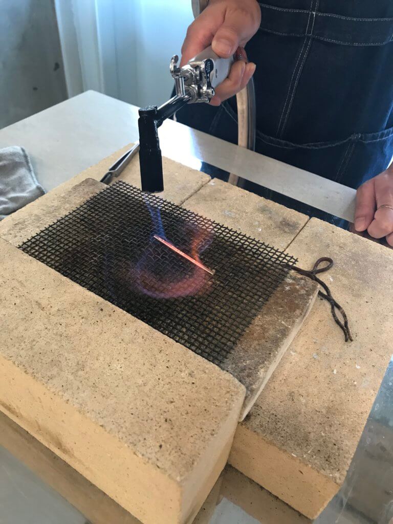 テクスチャーを入れる前や、曲げる前にはバーナーで火を入れます。金属はたたくと硬くなる性質があるので、加工しやすくするために火をあててあげます。
