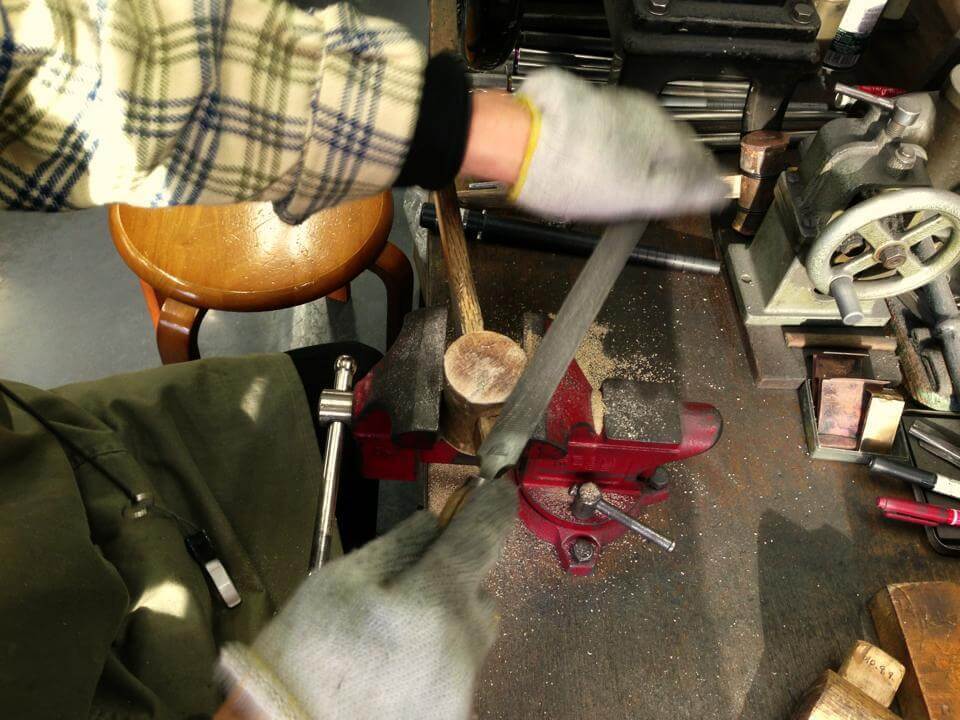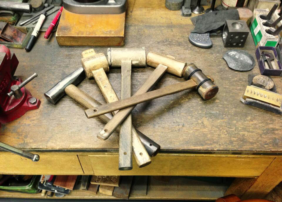 細い指輪のサイズ直しなどでは、皮を貼った木槌を使いキズがつかないように加工します。